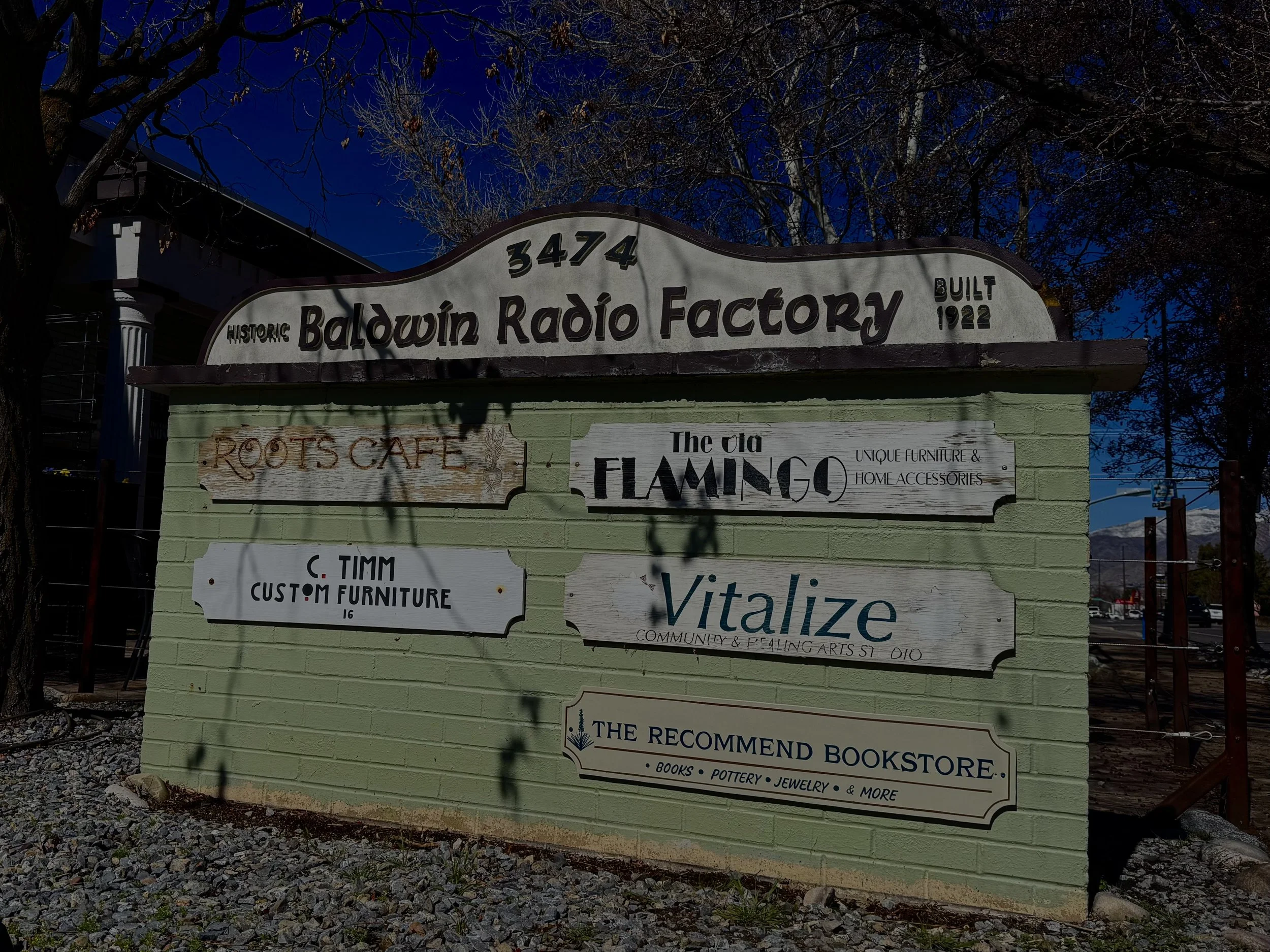 Nathaniel Baldwin, the inventor of headphones, constructed the building in 1922 to produce headphones, speakers, and other radio equipment. At one time it employed over 300 people, and was powered by an electrical generator on Millcreek that he designed. Baldwin was a generous employer who paid high wages and even built 12 bungalows along nearby Evergreen Avenue to house some of his employees. Baldwin at one time employed Philo T. Farnsworth, the inventor of television, and local legend has it that Farnsworth built some early prototypes in Baldwin's factory. Another notable employee was James B. Lansing, inventor and founder of JBL speakers, who worked at the factory around 1925. Baldwin's company fell casualty to the Great Depression, and the building became a home for his family during the 1930s. Since then the building has found various uses and tenants, including the International Institute of Hair Design and Radius Engineering, from the 1960s to the 1990s. In 1996 it was acquired by Kevin Flynn, who has since renovated the building into the art space that it is today, with 16 art studios, a yoga/massage studio (Vitalize), a funky furnishings store (The Old Flamingo), a hip cafe (Roots Cafe), and a furniture restoration shop (C. Timm Custom Furniture). Open houses/Art Strolls are routinely held where the public is invited to meet the artists and see their latest and greatest artistic creations. Please plan to come!